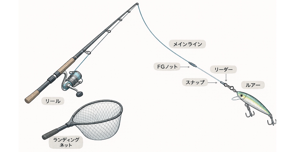 ロッドはルアーを投げて操作する竿です。リールはラインを巻き取る道具で、キャストややり取りを支えます。ラインは魚とつながる糸で、シーバスではPEラインが基本になります。リーダーはPEラインの先に結ぶ補助糸で、擦れや衝撃への対策として必要です。スナップはルアー交換をしやすくする小さな金具で、ルアーは魚を誘う疑似餌です。さらに、できればランディングネットも用意しておくと安心です。